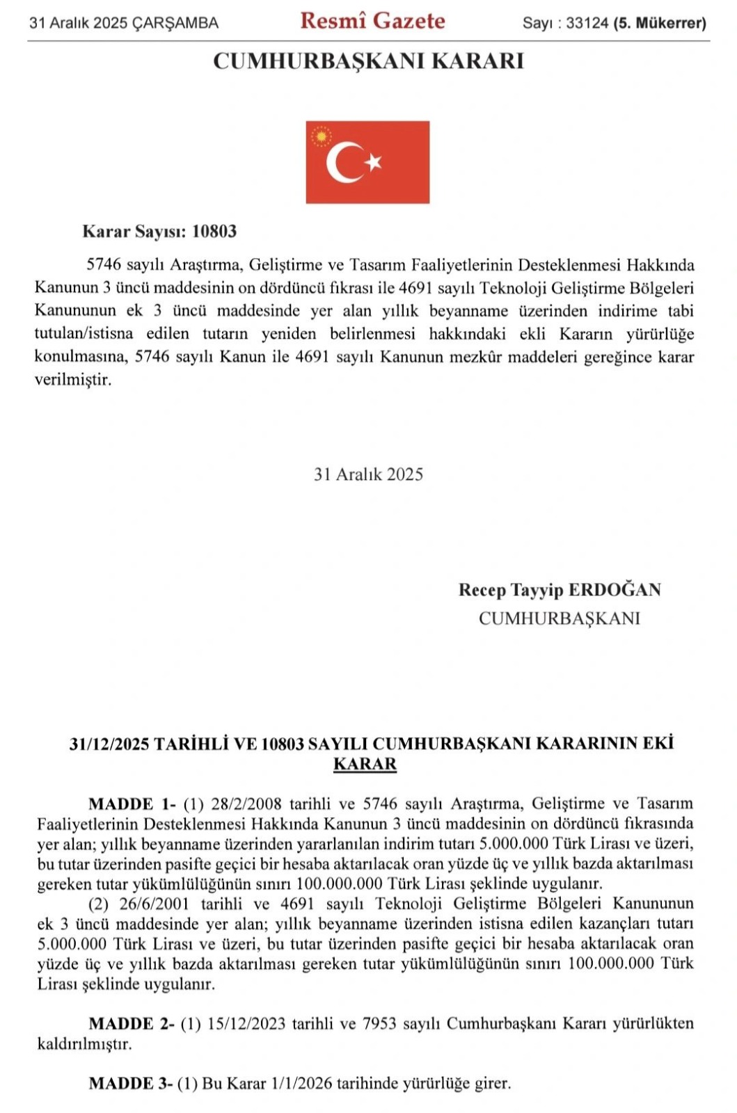 01.01.2026 tarihi itibariyle Gerek 28/2/2008 tarihli ve 5746 sayılı Araştırma, Geliştirme ve Tasarım Faaliyetlerinin Desteklenmesi Hakkında Kanunun 3 üncü maddesinin on dördüncü fıkrasında; Gerekse de 26/6/2001 tarihli ve 4691 sayılı Teknoloji Geliştirme Bölgeleri Kanununun ek 3 üncü maddesinde yer alan yıllık beyanname üzerinden yararlanılan indirim tutarı 5.000.000 Türk Lirası ve üzeri, bu tutar üzerinden pasifte geçici bir hesaba aktarılacak oran yüzde üç ve yıllık bazda aktarılması gereken tutar yükümlülüğünün sınırı 100.000.000 Türk Lirası şeklinde uygulanır.